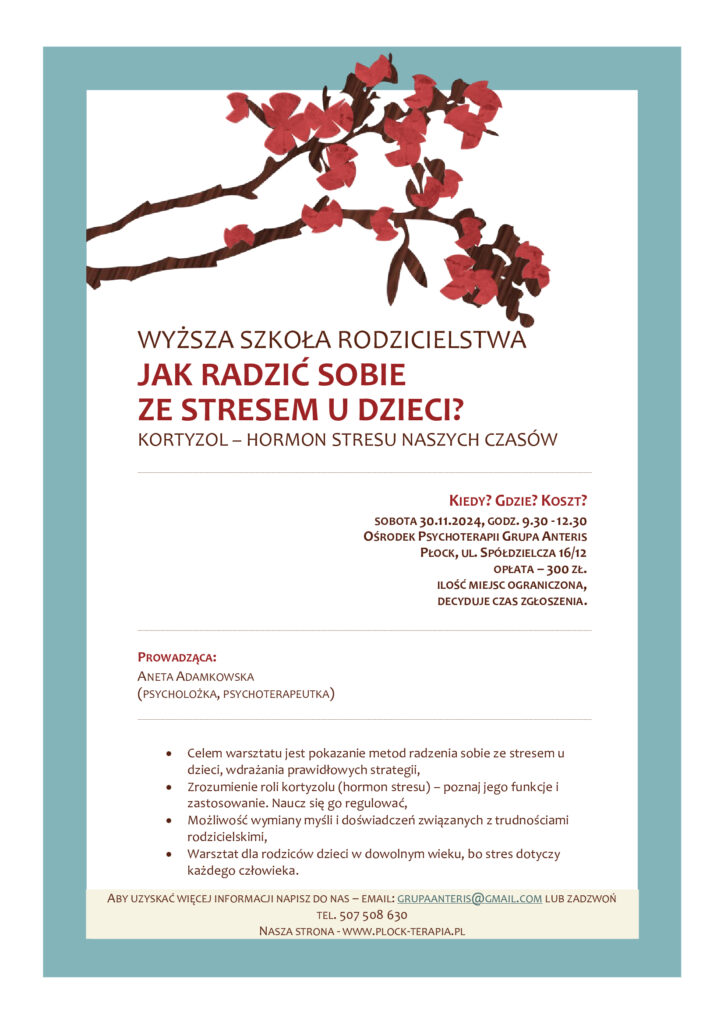 Zapraszamy na nasze szkolenie rodziców dzieci w każdym wieku. Będziecie mogli wymienić doświadczenia, nauczyć się praktycznych metod, obniżyć swoją własną ilość kortyzolu.